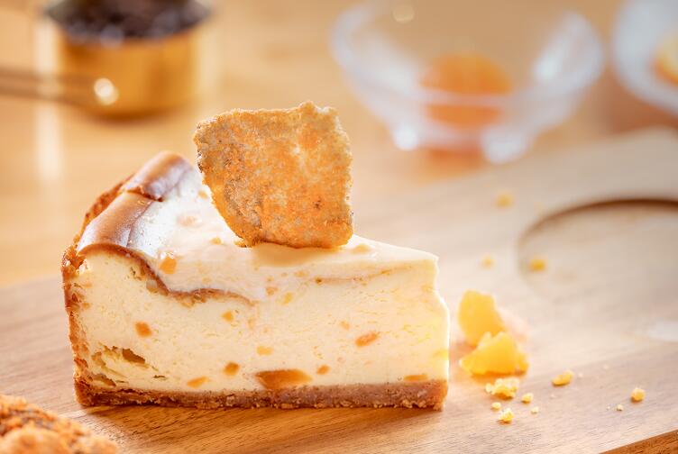 圖為Alternative café推出之「試錯餐單」中的Golden Trio黃金魚皮芝士餅,將預先炒香的鹹蛋黃加入濃郁的紐約芝士餅漿烤焗,蛋糕面配上鹹香的炸魚皮,三種不同口感完美融合,突出中西合璧的港式味道。