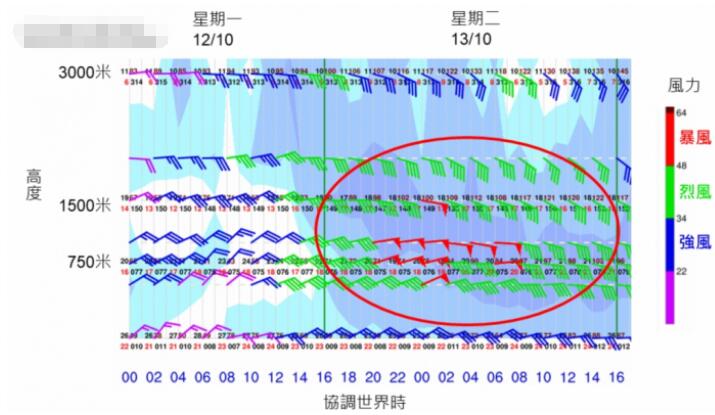 電腦模式在12日預測13日早上高空近1000米的風力。天文台圖片