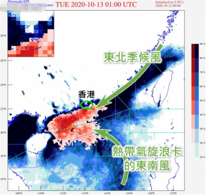 天文台補充,原先預料會有狂風大雨。當季候風的東北風和熱帶氣旋「浪卡」的東南風在華南沿岸附近匯聚,空氣中的水汽被迫抬升後冷卻,產生降雨。降雨夾雜「大風」會令天氣變得惡劣。各大電腦模式在12日均預測13日香港或近岸地區會有大雨,而與雨帶相關的狂風亦會影響本港。13日下午的雷達圖可以見到有頗強的雨帶在南海北部靠近廣東沿岸,但受較乾的東北季候風影響,這些強雨帶在移近沿岸地區時有所減弱,因此本港的雨勢,特別是13日早上的雨勢較電腦預測為弱,而烈風影響的範圍亦主要集中在本港高地及南部地區,令13日上午的天氣比預測好。