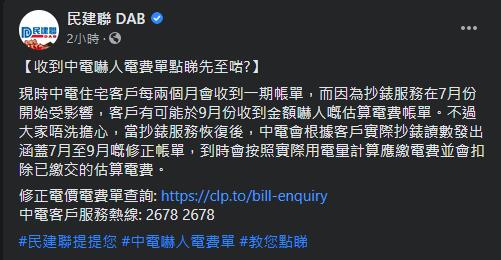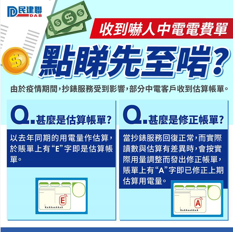 民建聯今日在社交平台發文,指電力公司的抄錶服務由7月份開始受到影響,令市民於9月份會收到金額驚人的估算電費單。民建聯呼籲市民不需擔心,因電力公司抄錶服務回復正常後,會根據客戶實際抄錶讀數發出修正帳單,按照實際用電量計算應繳電費並會扣除已繳交估算電費。