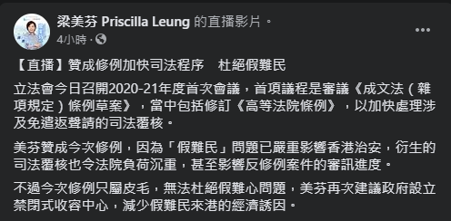 立法會經民聯議員梁美芬在社交平台表示贊成修訂《高等法院條例》。她認為,「假難民」問題嚴重影響香港治安,當中衍生的司法覆核令法院負荷沉重,甚至影響修例风波案件的審訊進度。梁美芬表示,今次修例無法杜絕假難民問題,建議政府設立禁閉式收容中心,減少假難民來港的經濟誘因。(记者唐信恒)