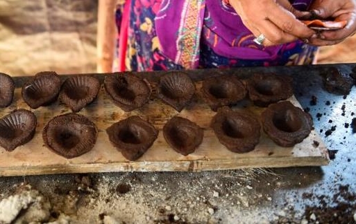 印度婦女們在排燈節前用牛糞和泥混合製作油燈。(法新社)