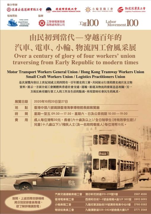 圖為『由民初到當代----穿越百年的汽車、電車、小輪、物流四工會風采展』海報,提供更多展覽詳情。圖片來源:工聯會臉書(Facebook)專頁