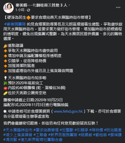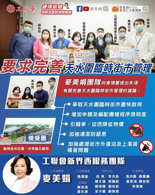 工聯會新界西立法會議員麥美娟今日(15日)於社交平台发文,表示已約見食物及環境衛生署助理署長及元朗區環境衛生總監,提出多項重點建議,為天水圍居民提供價廉、多元的購物選擇。