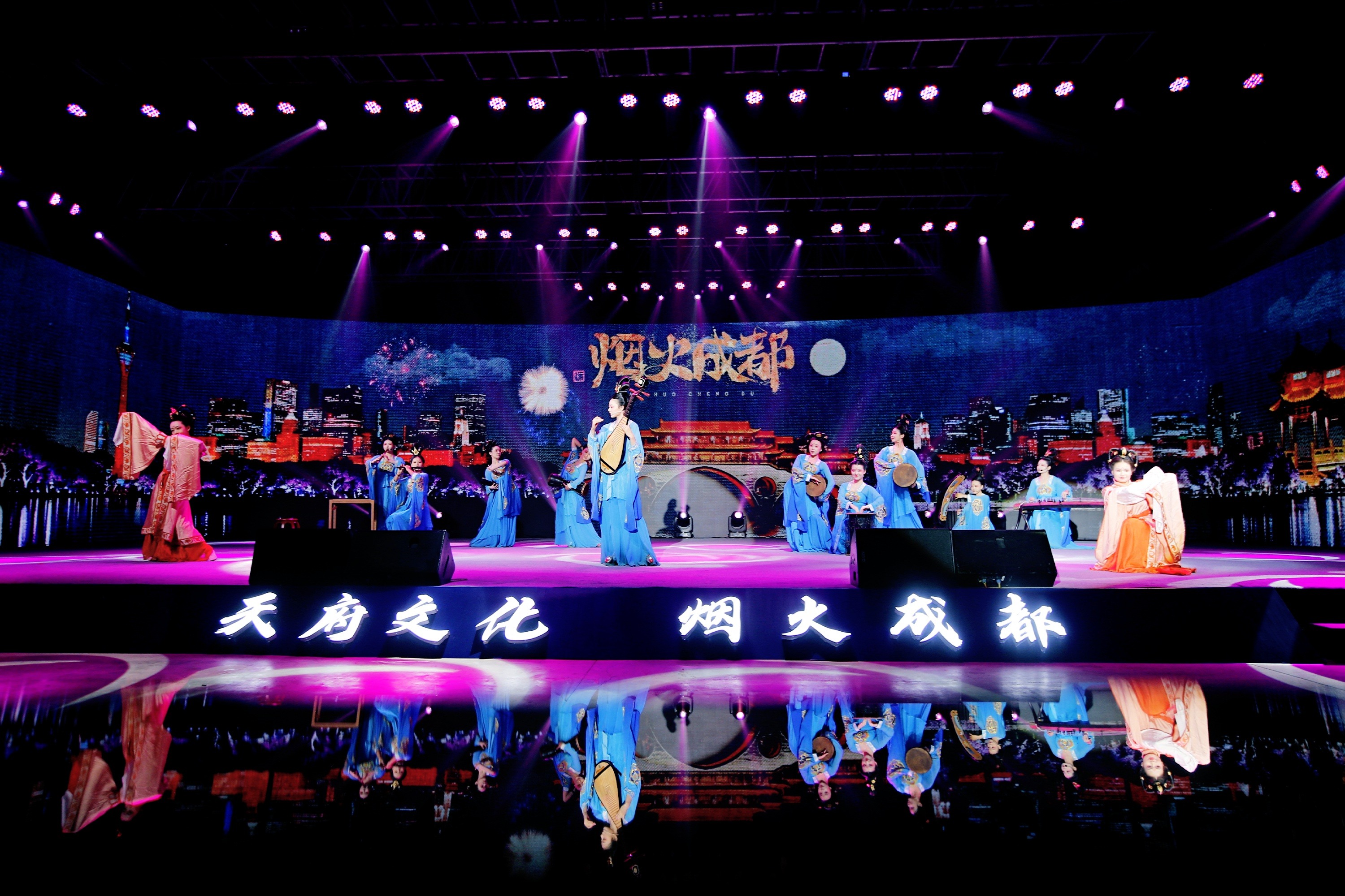 《烟火成都》以五代伎乐穿越千年为主线,以「商肆熙攘、书韵悠长、雪山在望、舌尖留香、艺文交响、锦江笙簧」六大篇章为主线,选取书屋、火锅、艺术村等成都市井街巷当中具有浓鬰烟火气的城市空间,用「古画、古装、古乐、古技」元素,表达独特的天府文化韵味和多元包容的城市精神。