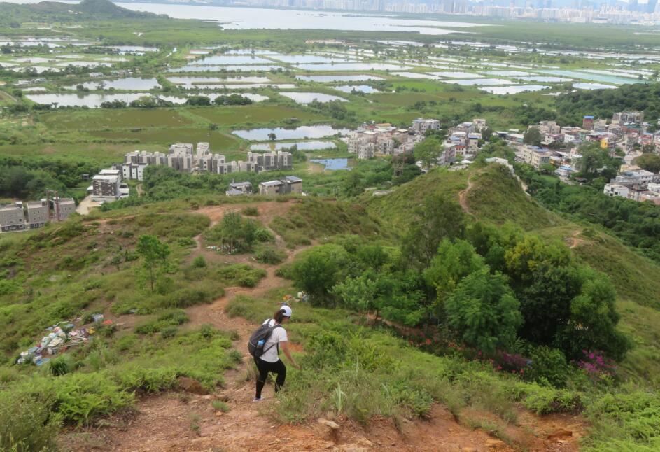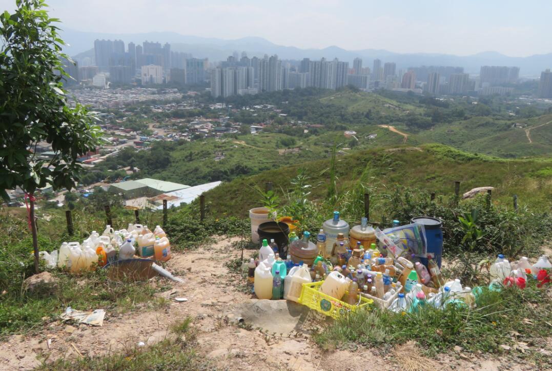 丫髻山風景優美,可賞豐樂圍阡陌魚塘、遠眺后海灣及深圳,但部分土地卻被非法佔用,右邊箭嘴為隱身樹叢中的小花園,左邊箭嘴為膠樽、膠桶等雜物。