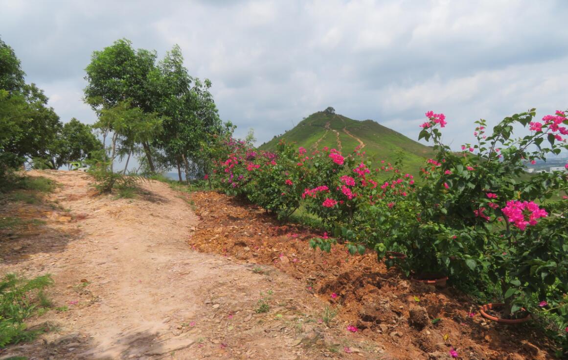 泥土被翻開,安插花盆。遠處為丫髻山山頂。