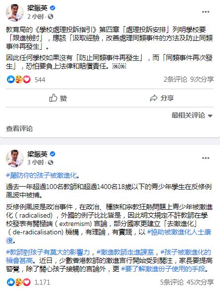 梁振英表示,過去一年超過100名教師和超過1400名18歲以下的青少年學生在修例風波中被捕。修例風波是政治事件,在政治、種族和宗教狂熱問題上青少年被激進化(radicalised) ,外國的例子比比皆是,因此明文規定不許教師在學校發表有關極端(extremism) 言論,部分國家更建立「去激進化」(de-radicalisation) 機構,有理論,有實踐,以協助被激進化人士康復。