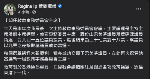 葉劉淑儀今日(16日)在社交平台表示,自己已完成主持最後一次的教育事務委員會會議,並順利選出新一屆主席。她祝賀以9票之差獲勝的梁美芬議員當選立法會教育事務委員會新主席。葉劉淑儀指教育對香港極為重要,所以她往後會繼續關注及跟進各項教育議題,造福香港下一代。