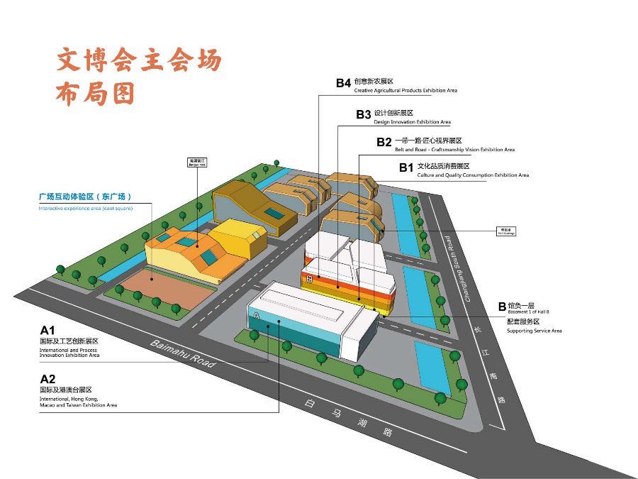 本屆文博會設置主會場、線下分會場和線上分會場:主會場共設置國際及工藝創新展區、國際及港澳臺展區、文化品質消費展區、一帶一路·匠心視界展區、設計創新展區、創意新農展區等6大展區,展示面積約7萬平米。