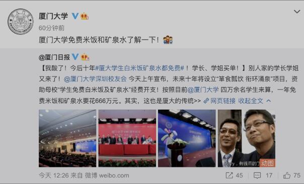 17日,厦门大学深圳校友会宣布,2021年到2030年的十年间将为母校所有在校生的米饭和矿泉水买单!按照目前测算,如果要“承包”厦大四万名在校生一年米饭和矿泉水,一年要掏666万元,10年总共要捐出6660万元。