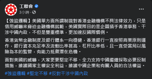 圖為工聯會批評美國制裁的貼文內容。圖片來源工聯會臉書(Facebook)專頁。