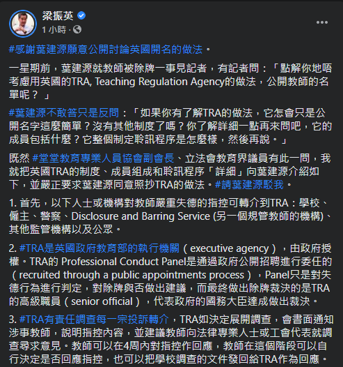 圖為全國政協副主席梁振英回應立法會教育界議員葉建源對英國Teaching Regulation Agency(TRA)反問的貼文內容。圖源:全國政協副主席梁振英臉書(Facebook)專頁。
