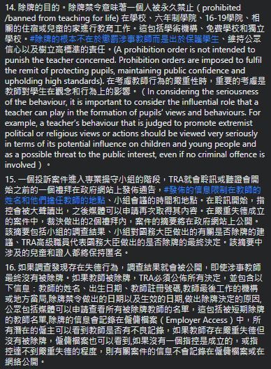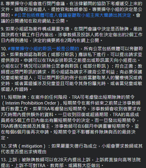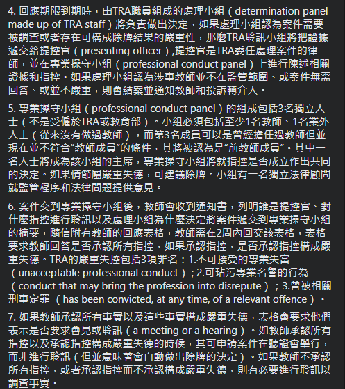 梁振英指,Teaching Regulation Agency是英國政府教育部的執行機關,由政府授權並通過政府公開招聘去進行委任,TRA的高級人員會作出是否除牌的裁決。假若TRA決定展開調查,它們會書面通知涉事教師指控內容。教師可在4周內回應,例如是向TRA提供學校調查的文件。在回應期過後,由TRA人員組成的處理小組將決定案件是否需要被調查。假若需要便會把證據交給提控官並在專業操守小組上陳述相關證據和指控。