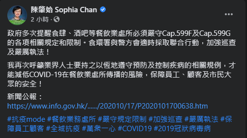 陳肇始在貼文中也再次呼籲餐飲業業界人士要持之以恆地遵守預防及控制疾病的相關規例,才可減低新冠肺炎在餐飲業處所傳播的風險,保障員工、顧客及市民大眾的安全。