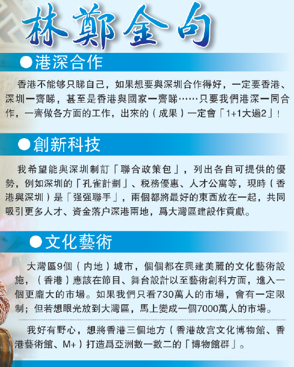 她認為,文化藝術反映一個城市的素質,並會對海外旅客產生極大吸引力,例如世界着名的奧地利維也納博物館區、德國柏林博物館島、東京博物館等。因此,她希望將香港故宮文化博物館、香港藝術館、M+等亦打造為亞洲數一數二的「博物館群」。這與深圳「十大」交相輝映,其中也蘊藏與深圳及灣區其他城市巨大的合作互動機會。