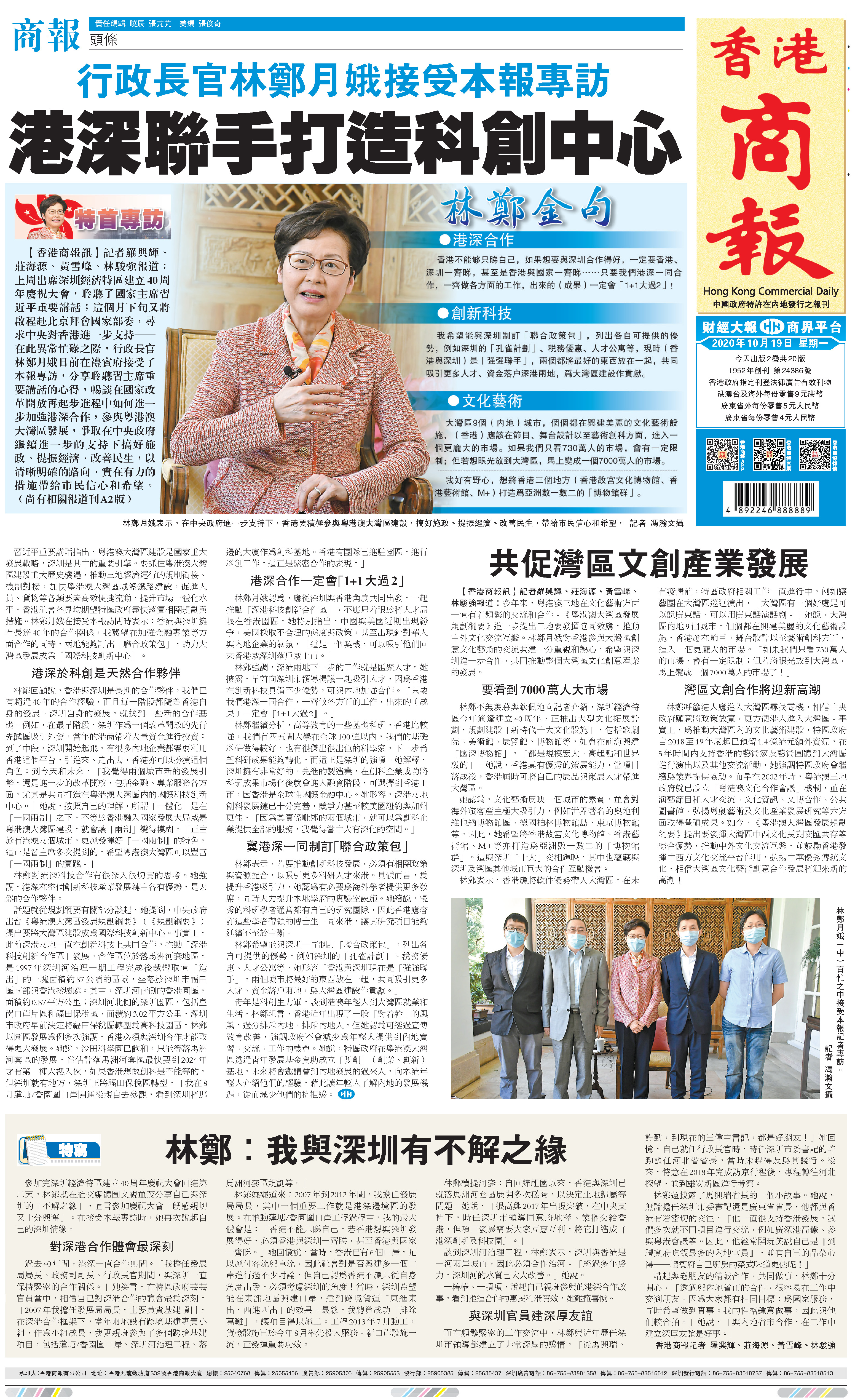 參加完深圳經濟特區建立40周年慶祝大會回港第二天,林鄭就在社交媒體圖文視並茂分享自己與深圳的「不解之緣」,直言參加慶祝大會「既感親切又十分興奮」。在接受本報專訪時,她再次說起自己的深圳情緣。