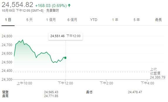 恒數中午收報24554點,升168點或0.69%,成交額728.78億港元(下同)。國指漲0.89%報10003.05點。