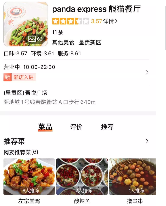 查询大众点评就会发现,确有一家「panda express熊猫餐厅」入驻了云南省昆明市呈贡新区的吾悦广场。开业以来,已有11位消费者对该餐厅进行打分,这家餐厅在满分5分里获得了3.57分,这个评分在大众点评上并不算高。