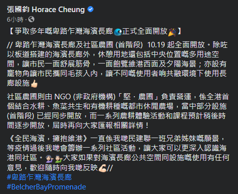 圖片說明:圖為民建聯立法會議員張國鈞談及卑路乍灣海濱長廊正式全面開放的貼文內容。