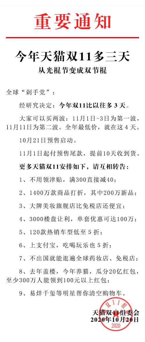 10月20日,天貓宣布,疫情後全球最大消費季「天貓雙11」正式開啟,10月21日啟動預售。今年最大的變化是:天貓雙11從光棍節變成雙節棍,分為兩波售賣期,11月1日-3日為第一波,11月11日為第二波。對於消費者來說,雙11比往年多了3天,11月1日就可以付預售商品的尾款,提前10天收到貨。