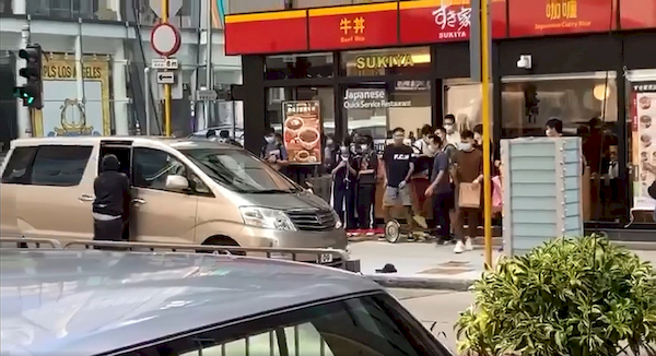 今日下午2時許,一對男女駕駛1輛7人車停泊在咸美頓街後,男事主步行到附近彌敦道570號基利商業大廈,到樓上1間找換店換取美金。其後準備返回車時,突被4名穿連帽子上衣、戴口罩的男子揮鐵鎚襲擊,男事主猝不及防受傷倒地,賊人承亂欲搶去他裝有美金的手袋,因當時街上有大量途人,見狀馬上喝止,多名男途人上前制服其中1人,其餘3名賊人見事敗馬上登上停在路旁的接應7人車,慌忙間車門亦未關上逃去無蹤。