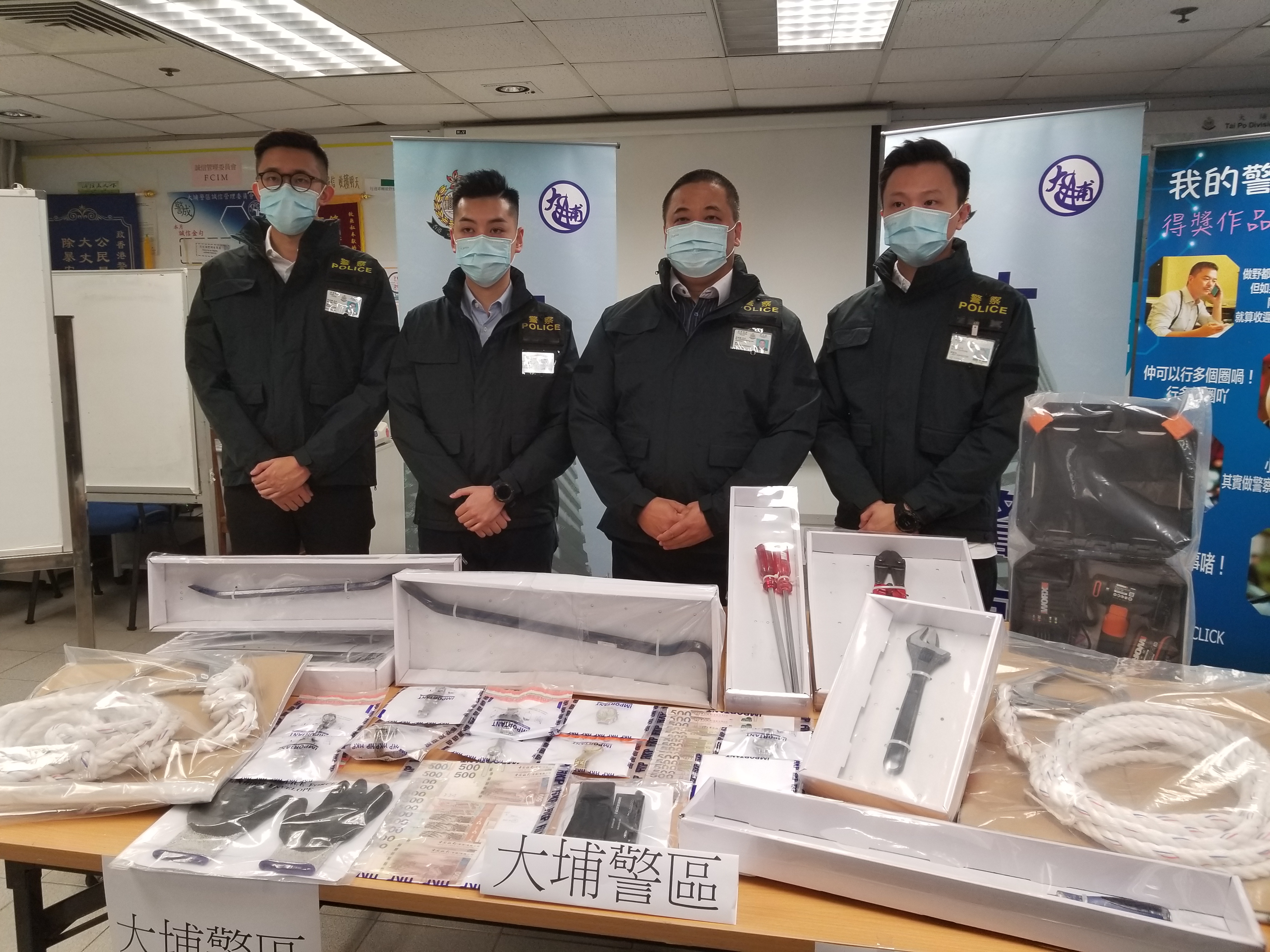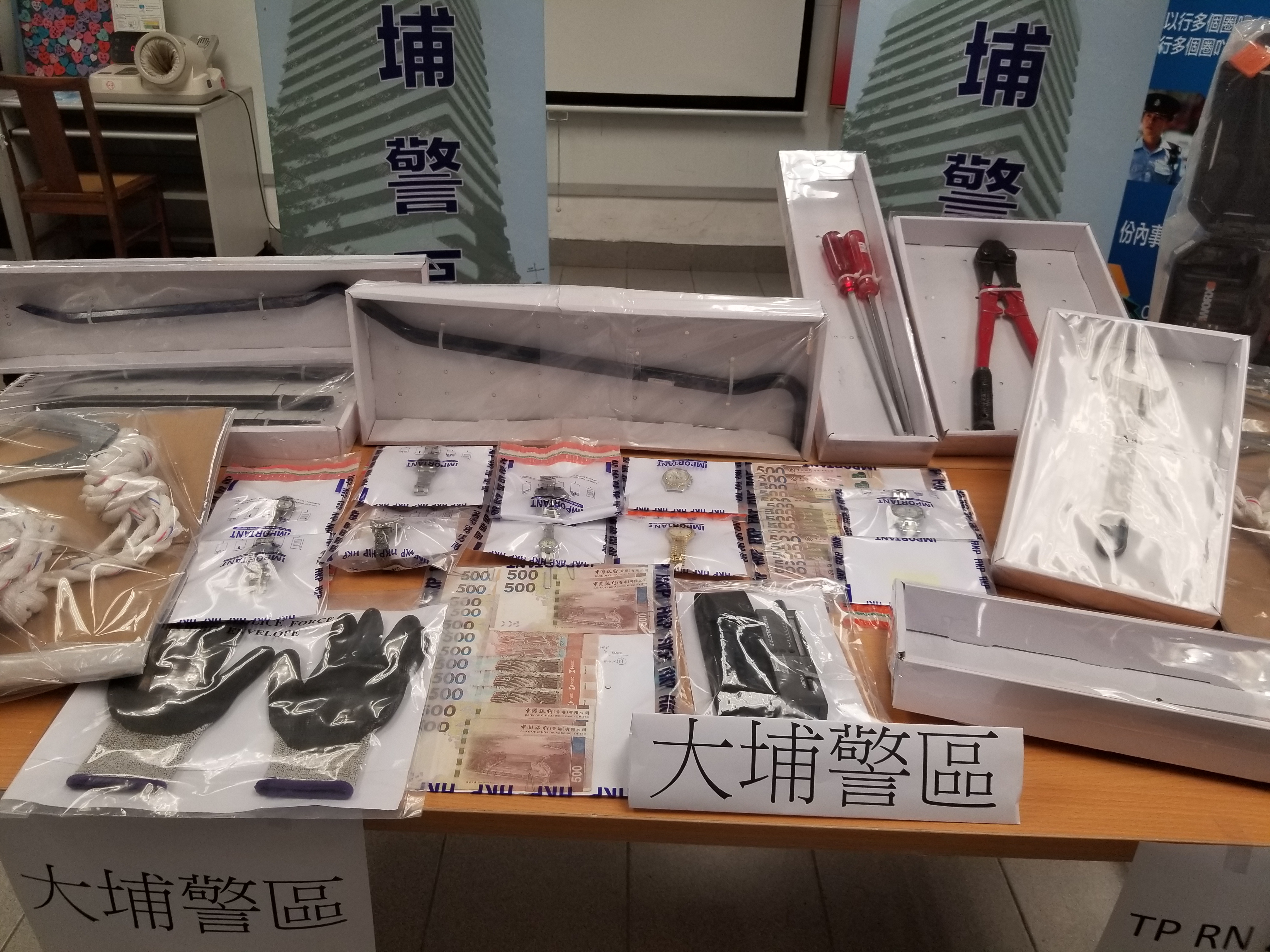 大埔助理指揮官(刑事)莊成逸警司表示,在10月初接獲1宗發生在大窩西支路1間村屋的爆竊案,經調查後鎖定1個爆竊集團,前日(19日)大埔刑事支援隊探員到將軍澳村拘捕3名疑犯,相信他們涉及11宗爆竊案,犯案地點包括大埔、沙田、屯門、西貢和港島西區,失物總值150萬元,同時起回現金和手錶約1萬元的失物。並在2輛涉案車輛上檢獲大批爆竊工具,包括鐵筆、板手、繩和切割機器等。