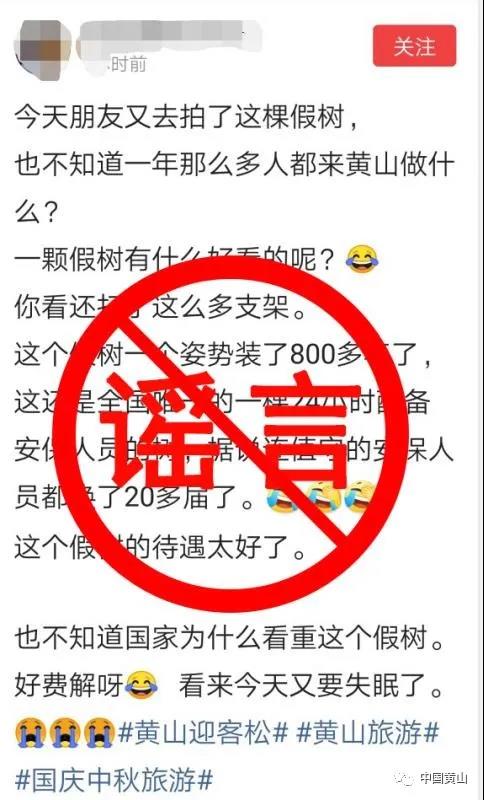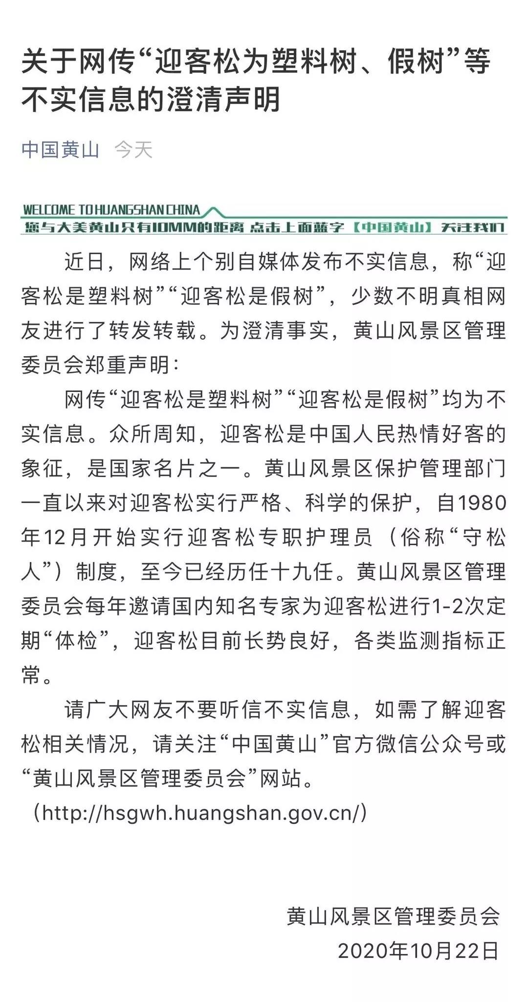 近日,網絡上個別自媒體發布不實信息,稱「迎客松是塑料樹」「迎客松是假樹」,少數不明真相網友進行轉發轉載。