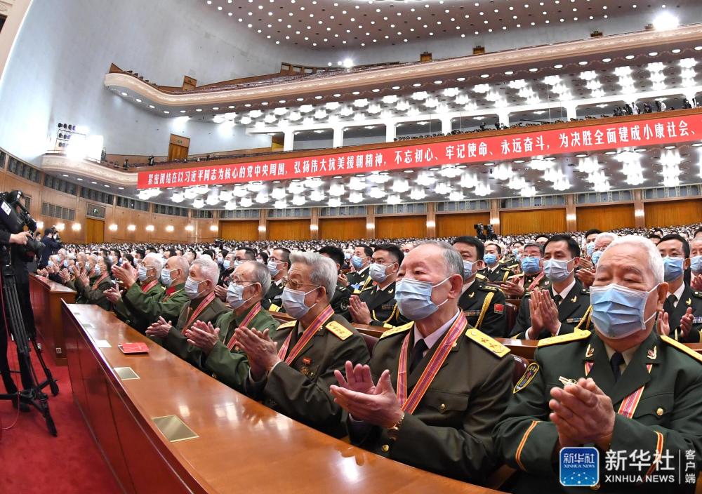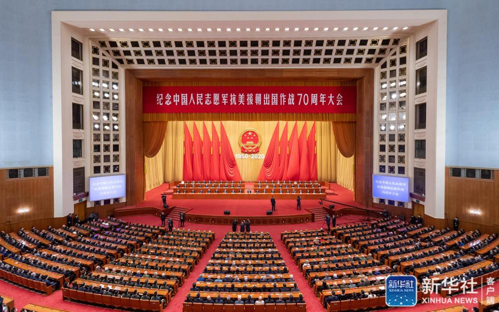 紀念中國人民志願軍抗美援朝出國作戰70周年大會23日上午在北京人民大會堂隆重舉行。中共中央總書記、國家主席、中央軍委主席習近平在會上發表重要講話強調,偉大的抗美援朝戰爭,抵禦了帝國主義侵略擴張,捍衛了新中國安全,保衛了中國人民和平生活,穩定了朝鮮半島局勢,維護了亞洲和世界和平。回望70年前偉大的抗美援朝戰爭,進行具有許多新的歷史特點的偉大鬥爭,瞻望中華民族偉大復興的光明前景,我們無比堅定、無比自信。我們要銘記抗美援朝戰爭的艱辛歷程和偉大勝利,弘揚偉大抗美援朝精神,雄赳赳、氣昂昂,向着全面建設社會主義現代化國家新征程,向着實現中華民族偉大復興的中國夢繼續奮勇前進。