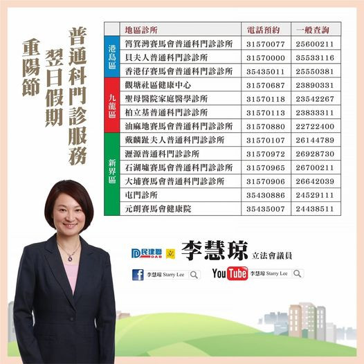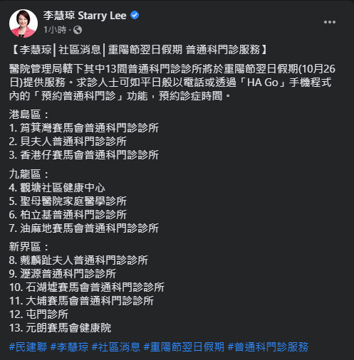 圖片說明:圖為民建聯立法會議員李慧琼交代於重陽節翌日假期提供服務的13間普通科門診之貼文內容