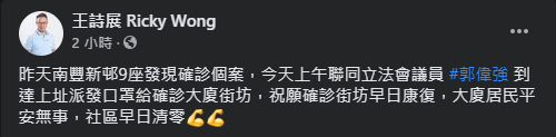 圖為東區區議員王詩展講述今日(25日)到南豐新邨9座派發口罩的貼文內容。