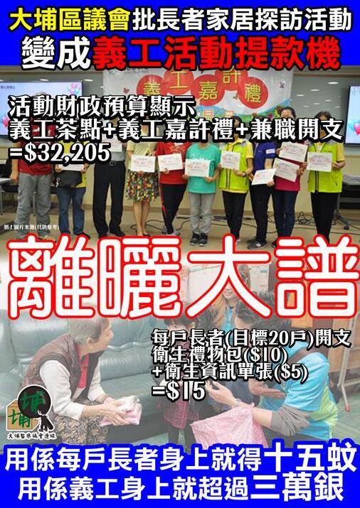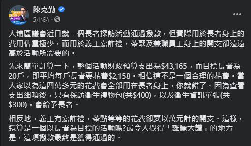 陳克勤指,長者探訪活動有20戶目標長者,而大埔區議會通過43165元撥款,所以他計算出平均1位長者花費2158元,但這是一個不合理的花費。陳克勤之後再談及撥款分配,發現長者只獲得衛生禮物包和衛生資訊單張,兩者合共700元,而其他支出是用作義工嘉許禮、茶聚及兼職員工身上。他表示長者探訪活動實際用於長者身上的費用佔重極少,因而質疑活動是否真的以長者為目標,並認為大埔區議會向長者探訪活動通過撥款是「離曬大譜」。(記者 唐信恒)