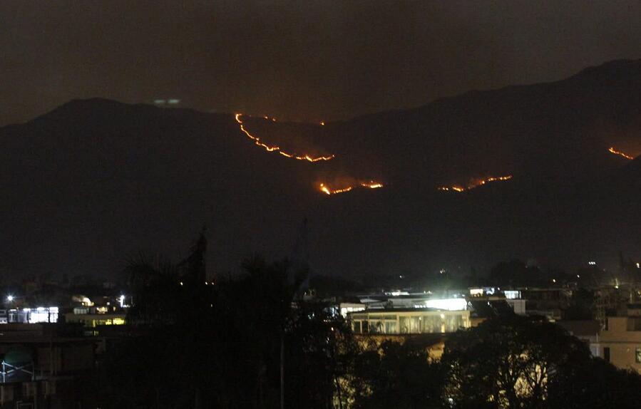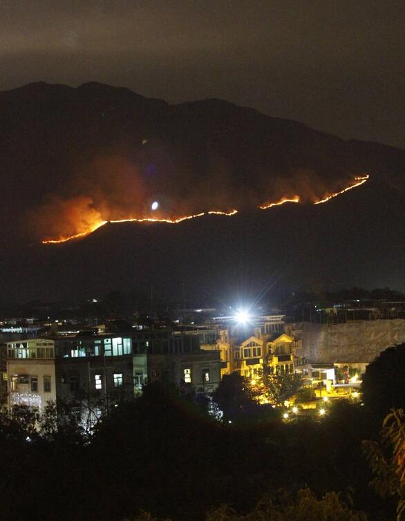 在錦田八鄉一帶山頭,至晚上仍有山火未撲滅,多條火龍在山上延綿不絕。