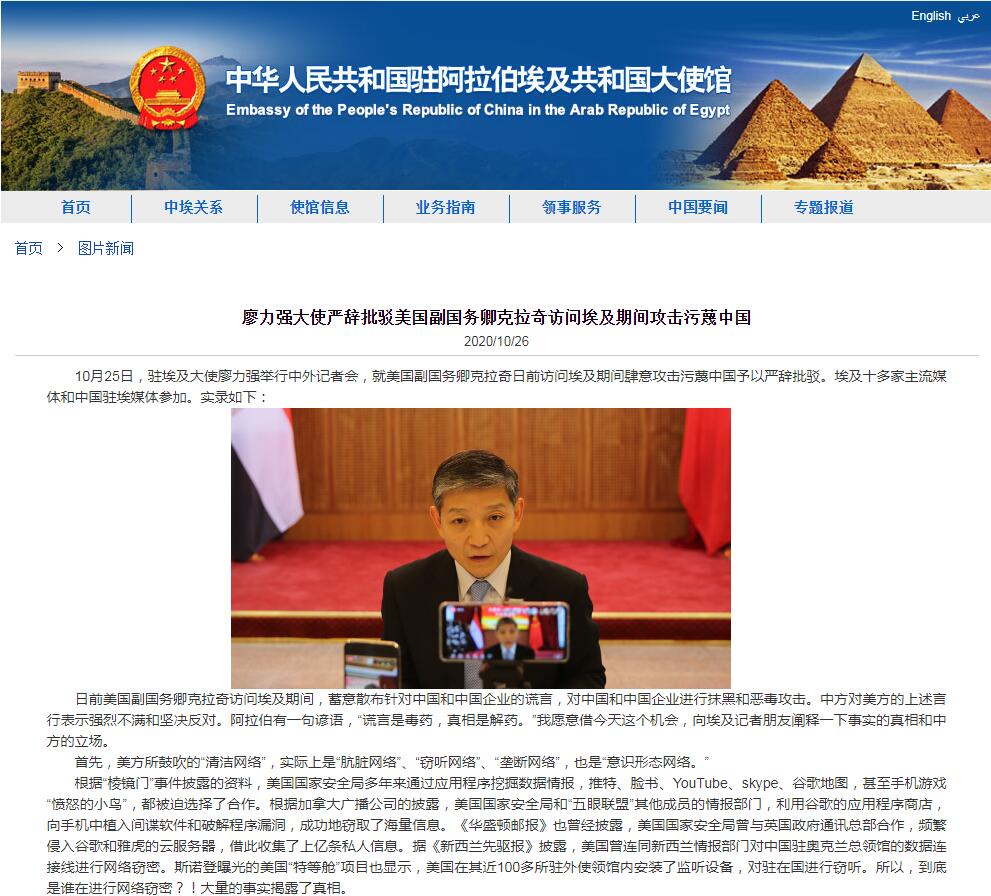 據中國駐埃及大使館網站消息,10月25日,駐埃及大使廖力強舉行中外記者會,就美國副國務卿克拉奇日前訪問埃及期間肆意攻擊污衊中國予以嚴辭批駁。埃及十多家主流媒體和中國駐埃媒體參加。實錄如下: