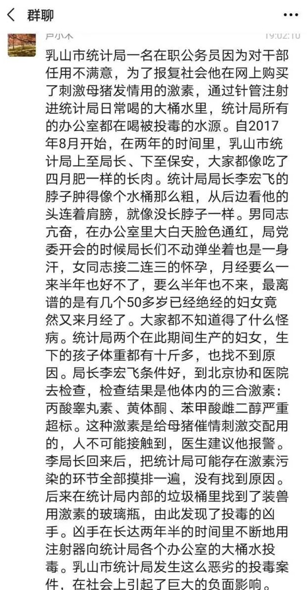 上述網傳的聊天紀錄顯示,「自2017年8月開始,在兩年的時間裏,乳山市統計局上至局長、下至保安,大家都像吃了四月肥一樣的長肉……局長李某飛到北京協和醫院去檢查,檢查結果是他體內的三合激素:丙酸睾丸素、黃體酮、苯甲酸雌二醇嚴重超標。這種激素是給母豬催情刺激交配用的,人不可能接觸到,醫生建議他報警。」