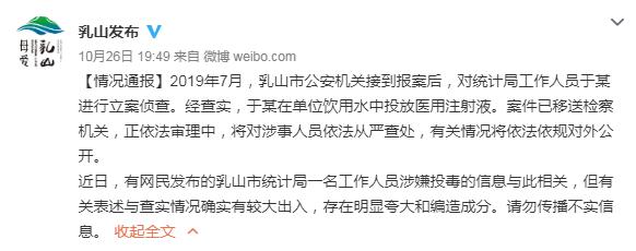 對此,山東省乳山市人民政府新聞辦公室官方微博「乳山發布」於10月26日晚回應,經查實,統計局員工於某在單位飲用水中投放醫用注射液。案件已移送檢察機關,正依法審理中。但網傳表述與查實情況確實有較大出入,存在明顯誇大和編造成分。網友對醫用注射液具體成分和危害表示關心,呼籲官方公布詳細情況。