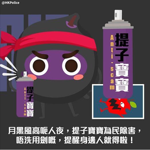 圖為警務處吉祥物提子寶寶,陪上經改寫的廣告對白,期望市民提高對電話騙案的警覺性。香港警務處Facebook