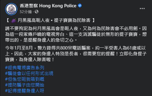 圖為警方提醒市民提高對電話騙案的警覺性之貼文內容。香港警務處Facebook