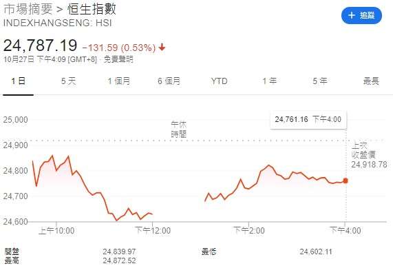 27日,恒指收報24787點,跌131點或0.53%。大型科技股強勢,恆生科技指數收漲0.84%。大市成交額1305.2億元。