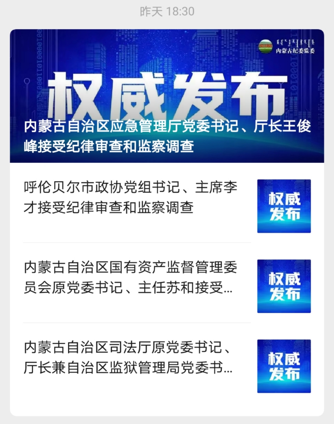 內蒙古自治區應急管理廳黨委書記、廳長王俊峰涉嫌嚴重違紀違法,目前正在接受紀律審查和監察調查。