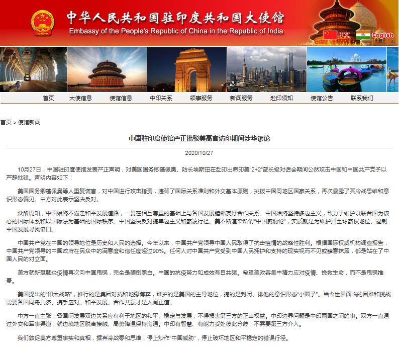 10月27日,中國駐印度使館發表嚴正聲明,對美國國務卿蓬佩奧、防長埃斯珀在赴印出席印美「2+2」部長級對話會期間公然攻擊中國和中國共產黨予以嚴辭批駁。聲明內容如下:
