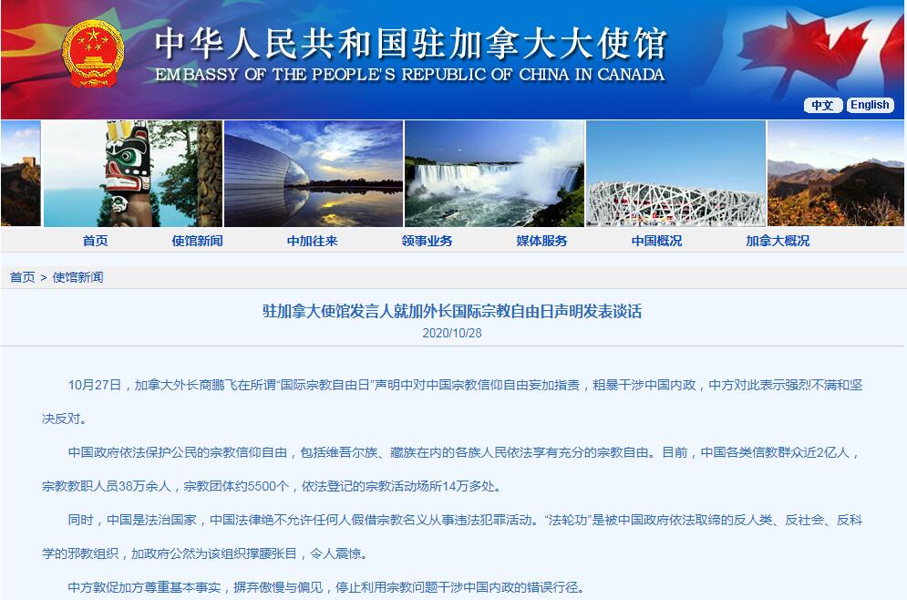 中國駐加拿大大使館官網28日消息顯示,10月27日,加拿大外長商鵬飛在所謂「國際宗教自由日」聲明中對中國宗教信仰自由妄加指責,粗暴干涉中國內政,中方對此表示強烈不滿和堅決反對。