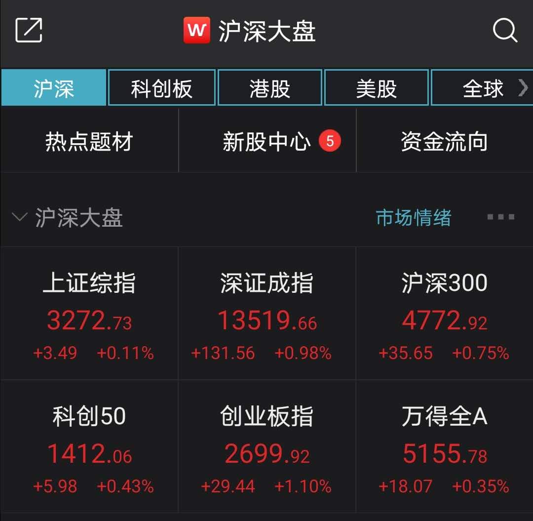 截至收盤,滬指報3272.73點,漲幅0.11%,成交額2786.06億元;深成指報13519.66點,漲幅0.98%,成交額5016.65億元;創業板指報2699.92點,漲幅1.1%;上證50指數報3324.44點,漲幅0.34%。