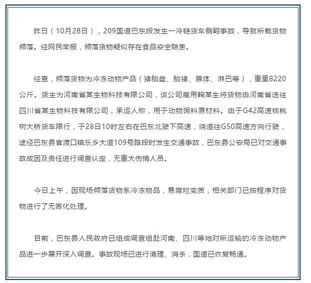10月28日,209國道巴東段發生一冷鏈貨車側翻事故,導致所載貨物傾落。經網民舉報,傾落貨物疑似存在食品安全隱患。