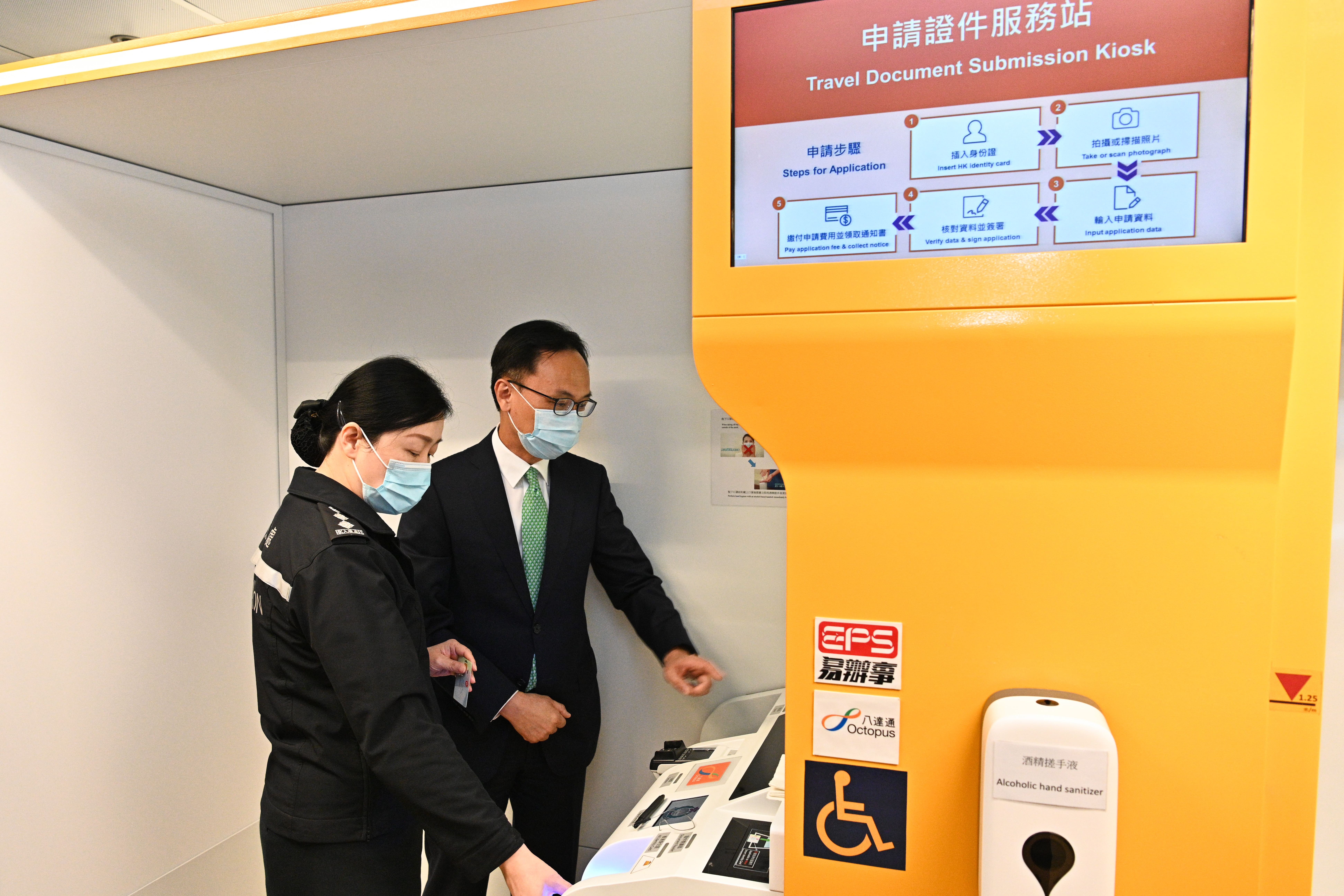 聶德權(右)了解使用申請證件服務站申請香港特別行政區護照的步驟。