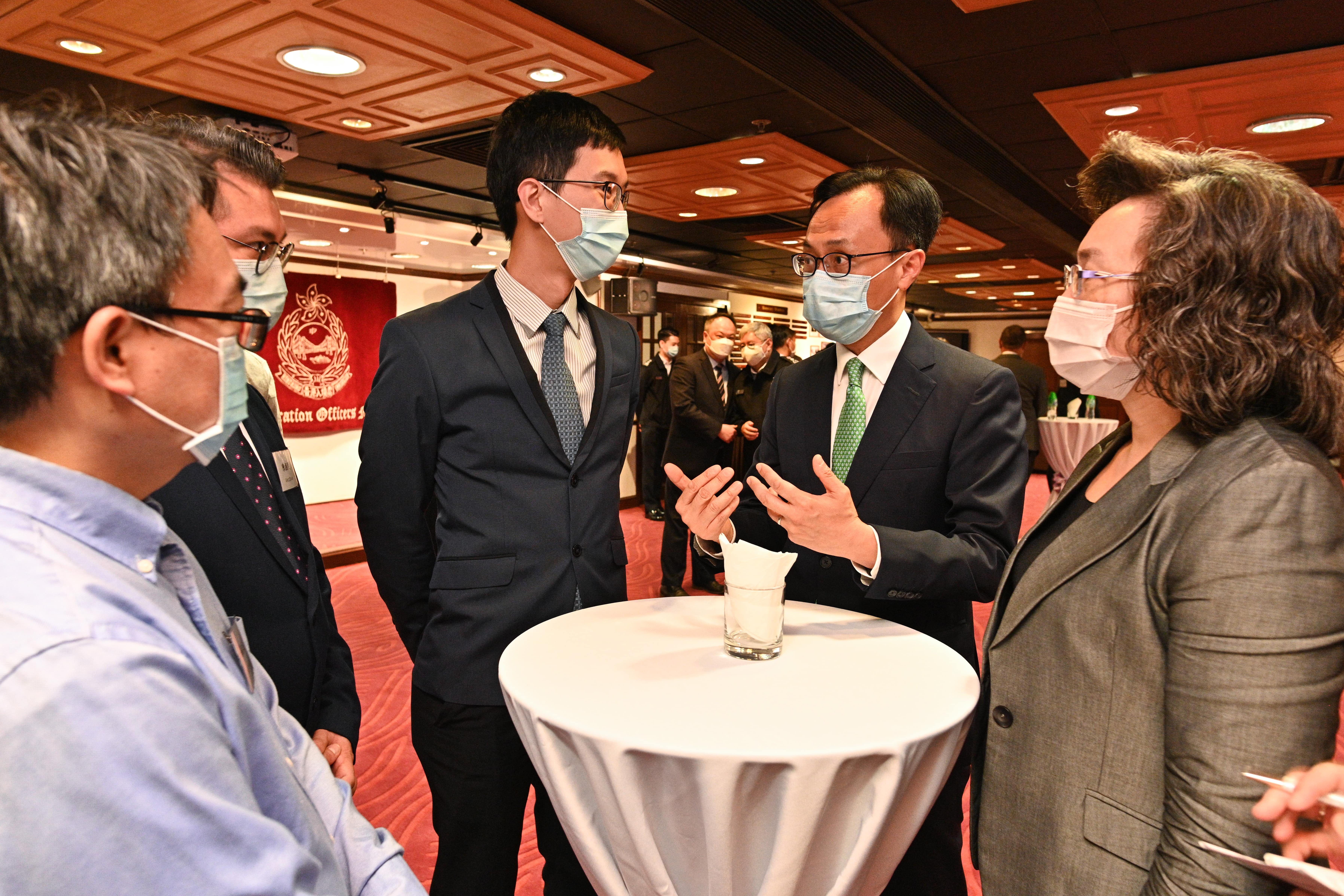 聶德權(右二)與部門各職系的員工代表茶敍,就他們關注的事宜交換意見。旁為公務員事務局常任秘書長楊何蓓茵(右一)。