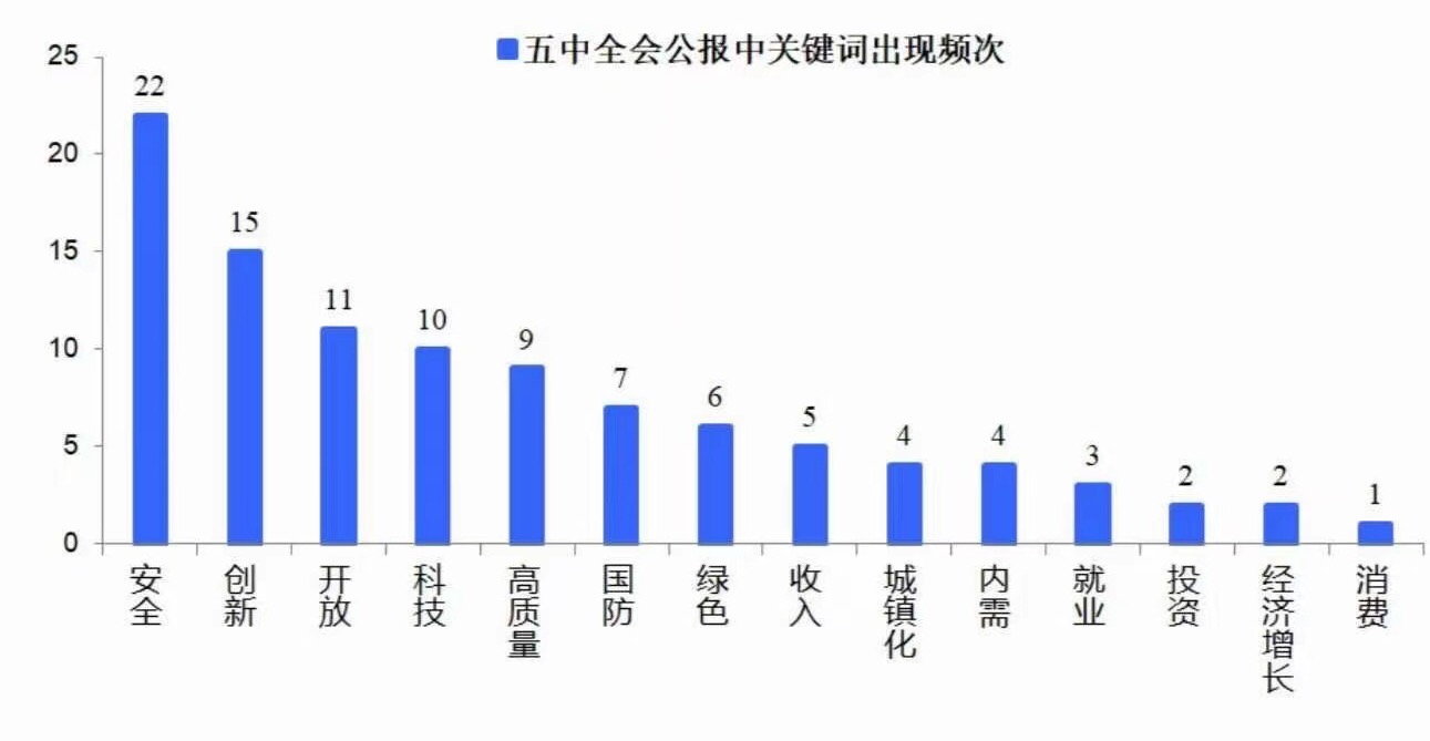 會議公報勾勒了未來5年中國經濟、社會的發展藍圖,明確提出了「十四五」時期經濟社會發展主要目標,屆時,我國更高水平開放型經濟新體制基本形成。從五中全會公報中搜索關鍵詞,「安全」、「創新」、「開放」出現頻次高居前三,為下一階段的新發展格局奠定政策主基調。