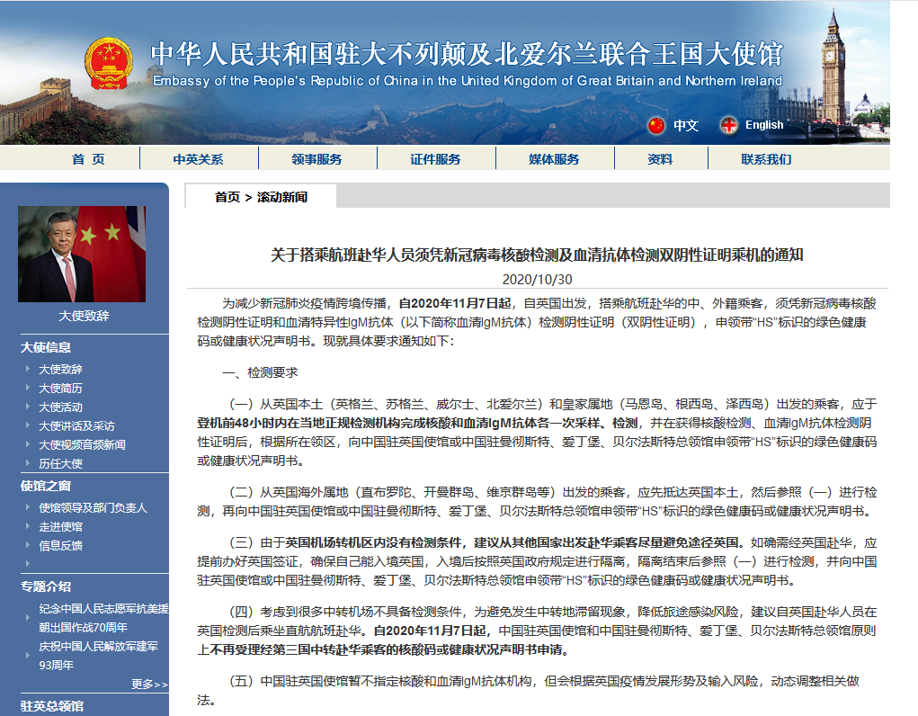 10月30日,中國駐英國大使館官網發布《關於搭乘航班赴華人員須憑新冠病毒核酸檢測及血清抗體檢測雙陰性證明乘機的通知》顯示,從英國時間2020年11月7日開始,自英國出發,搭乘航班赴華的中、外籍乘客,須在登機前48小時內在完成核酸和血清IgM抗體各一次採樣、檢測,憑檢測陰性證明(雙陰性證明)申領帶「HS」標識的綠色健康碼或健康狀況聲明書,否則不得登機。同時,《通知》中特別建議乘坐直航航班來華、回國,中國駐英國使領館原則上不再受理經第三國中轉乘客的雙檢測證明。