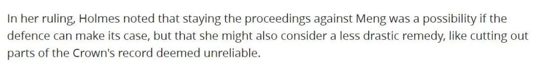 根據CBC等媒體的介紹,孟晚舟的律師表示,美國政府故意遺漏了本案的一些關鍵要素,而這些要素能夠證明孟晚舟沒有實施美方所指控的「欺詐」行為。所以,霍爾姆斯的這一裁決意味着,在明年2月的庭審中,孟晚舟方面可以據此提出新的證據,證明美加方面濫用訴訟程序,從而終止這場訴訟。