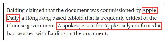 NBC稱,他們隨後還特意聯繫到了《蘋果日報》的一位發言人,該發言人確認,《蘋果日報》確實曾與巴爾丁就該報告進行過合作。